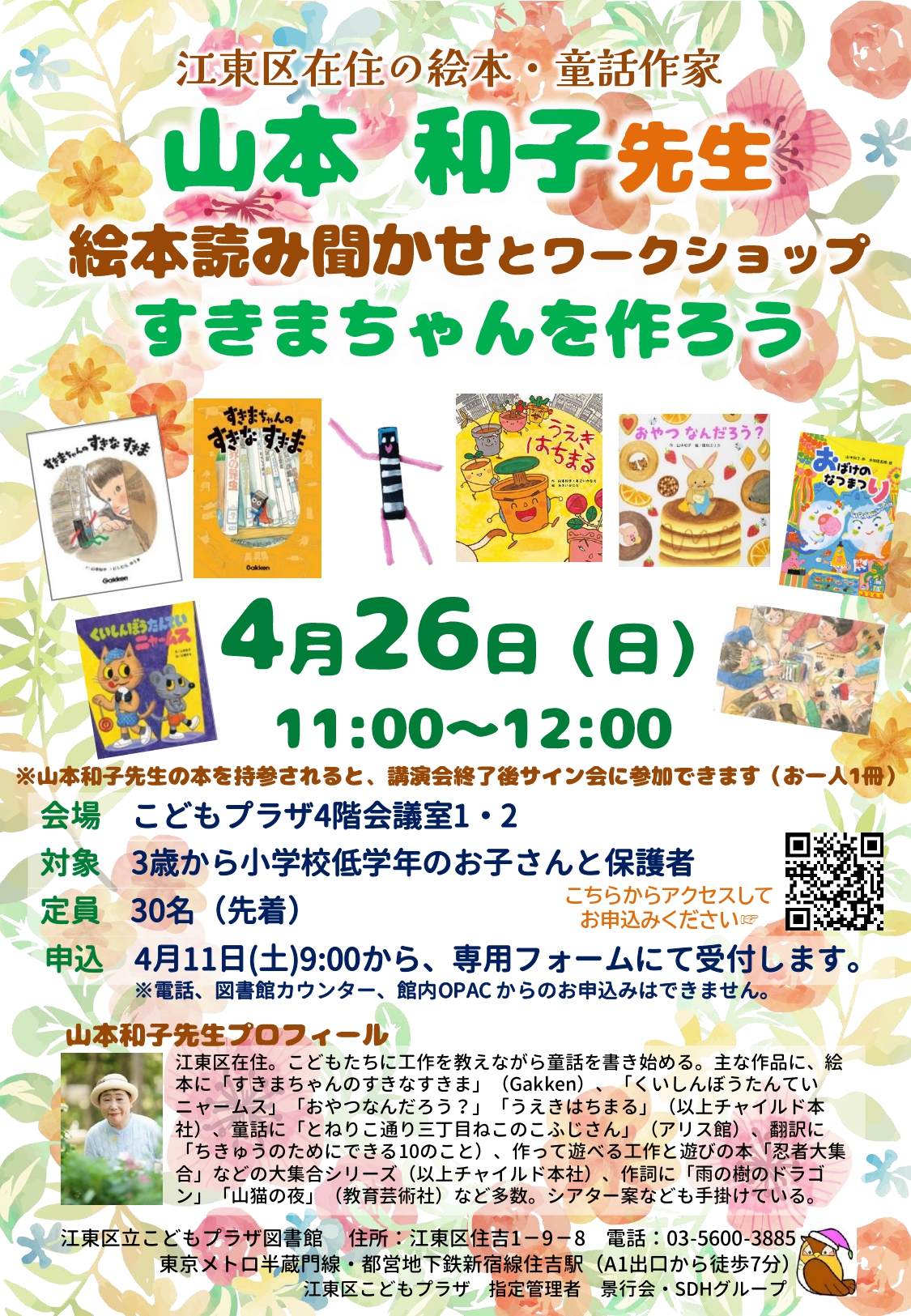 4月26日(日)江東区立こどもプラザ図書館で、絵本の読み聞かせと、すきまちゃんを作って遊ぶイベントがあります。11時〜12時で、先着30名までです。くわしくはポスターをご覧ください。